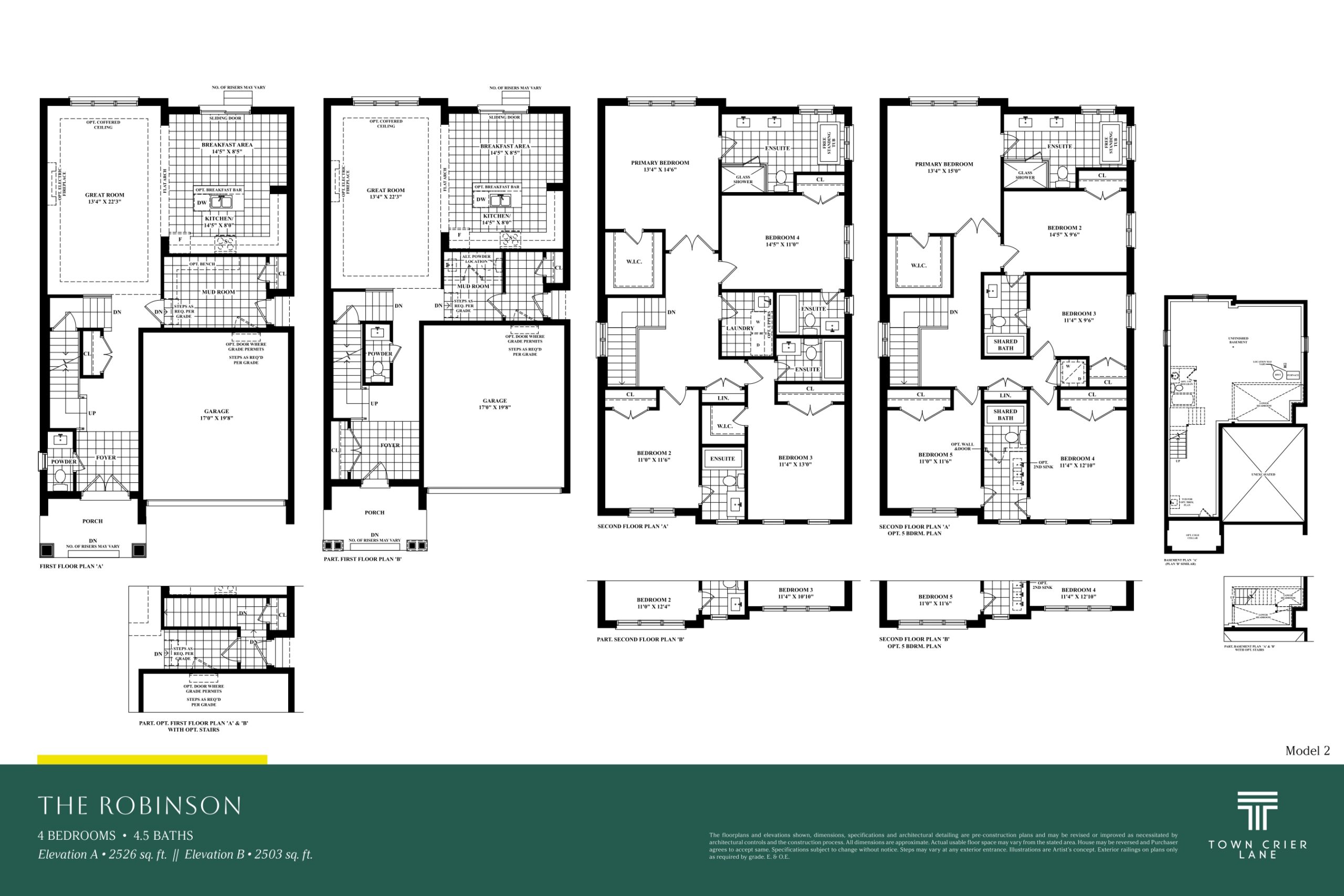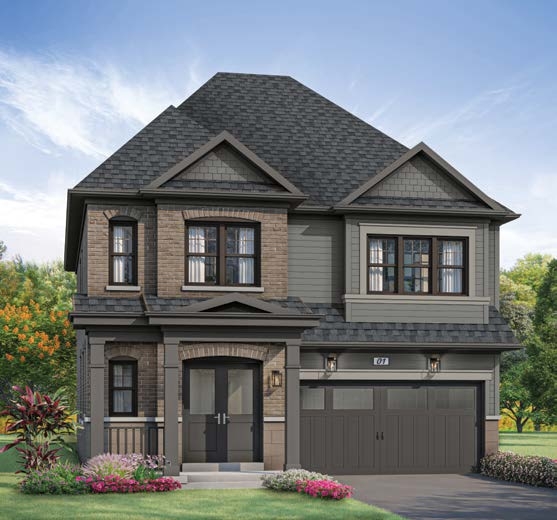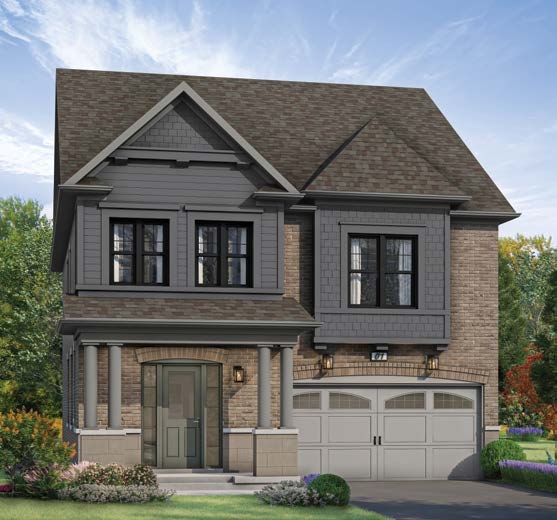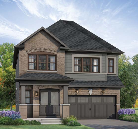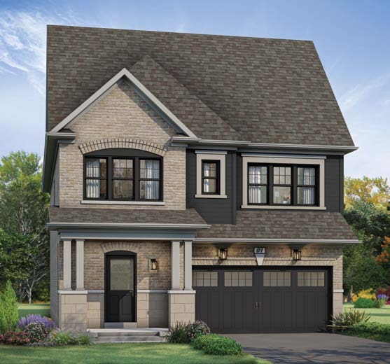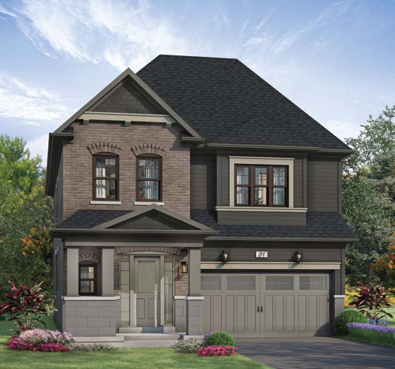 Striking brick detailing, vinyl and metal siding, as per elevation, with complementary roof.